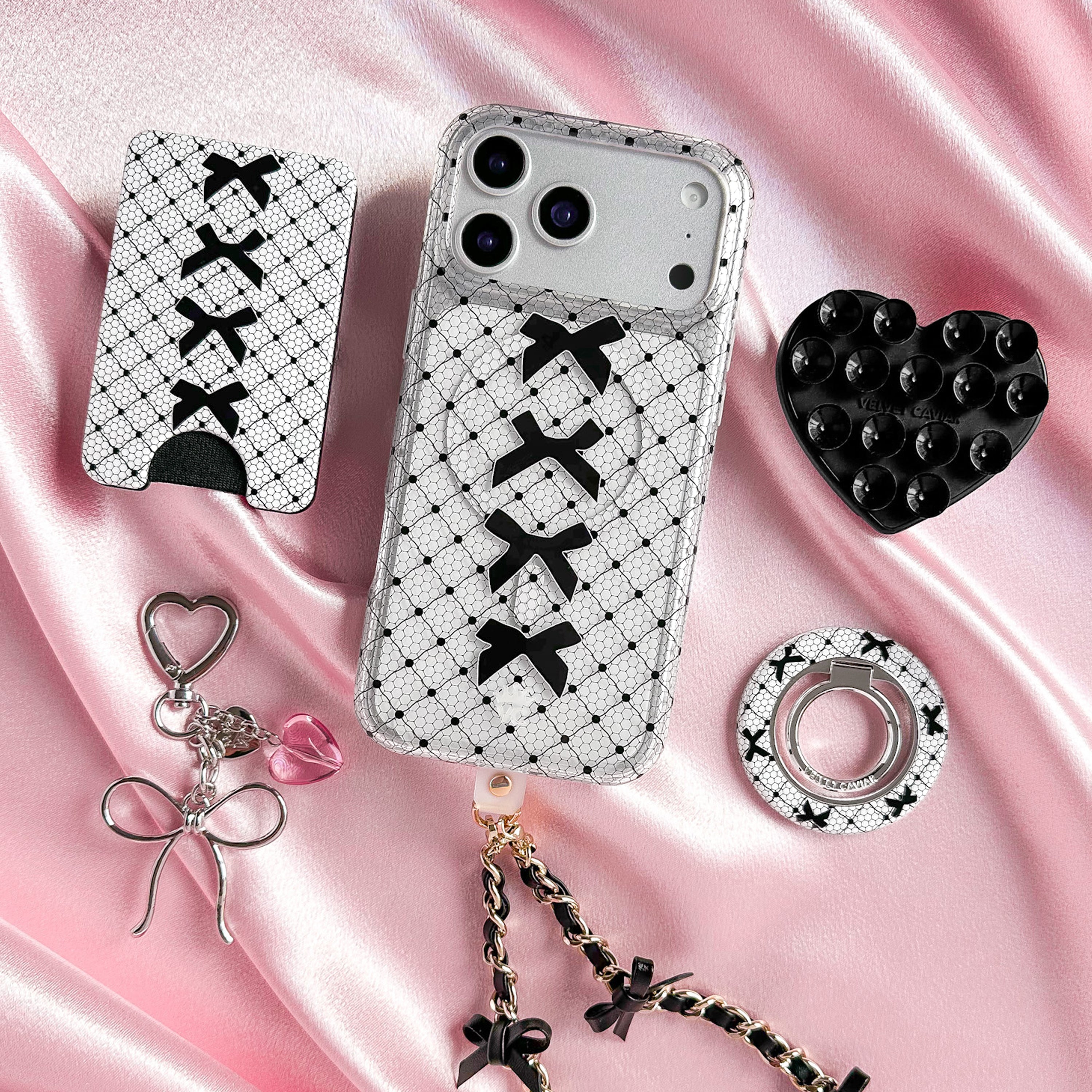 Lace Me Up! This Limited Edition MagSafe case features a clear base with glossy black lace and bow details.
