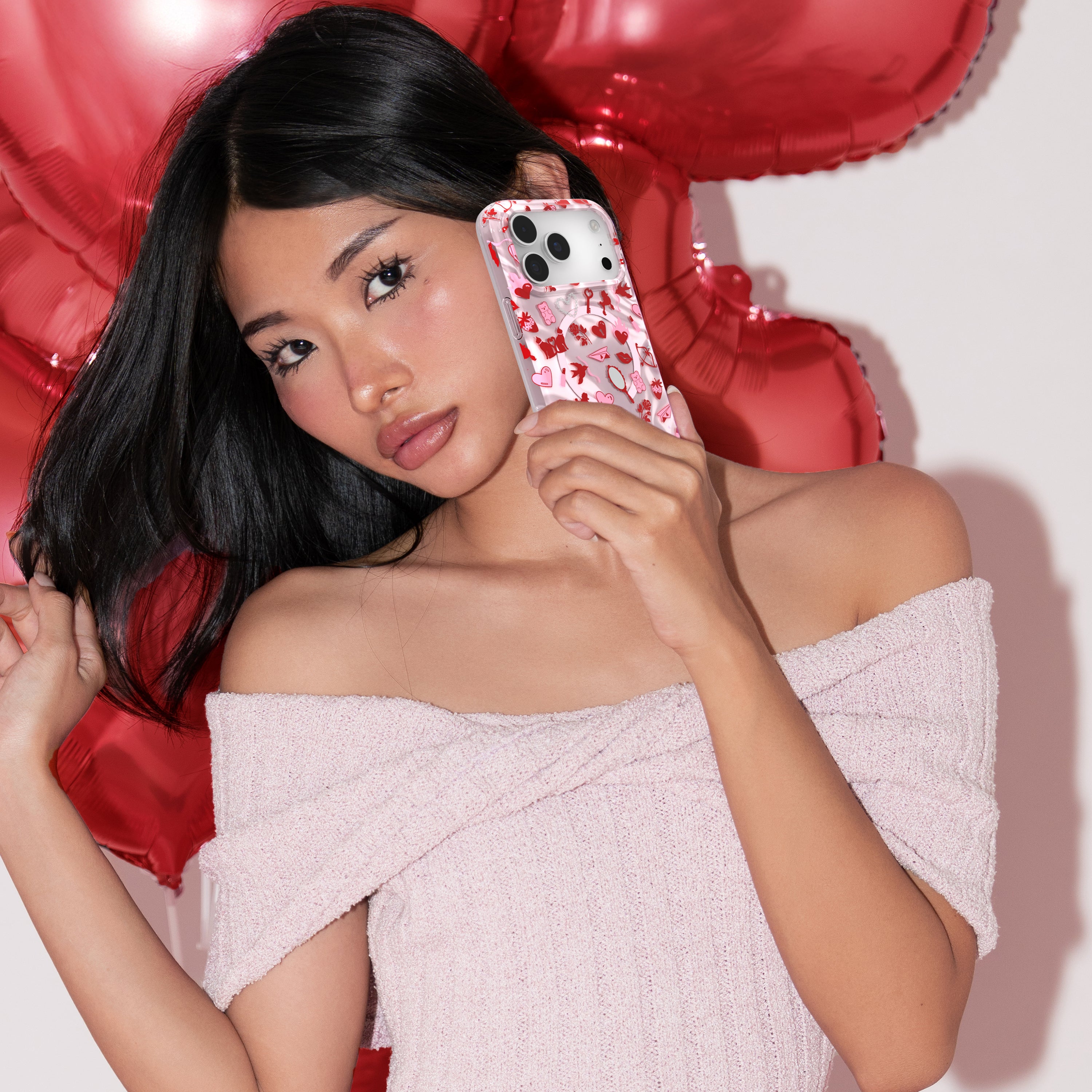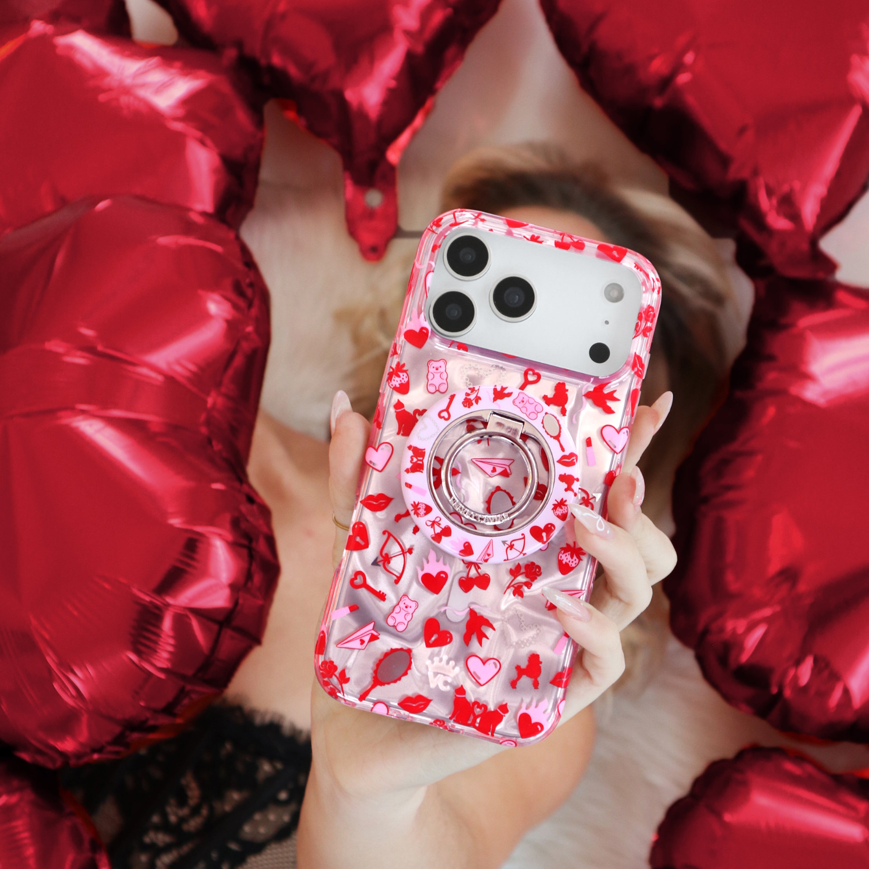 Fall in love! This stunning MagSafe phone case features red and pink hearts, kisses, Valentine's motifs, and chrome mirrors on a pinky silver base with a holographic wave effect throughout.