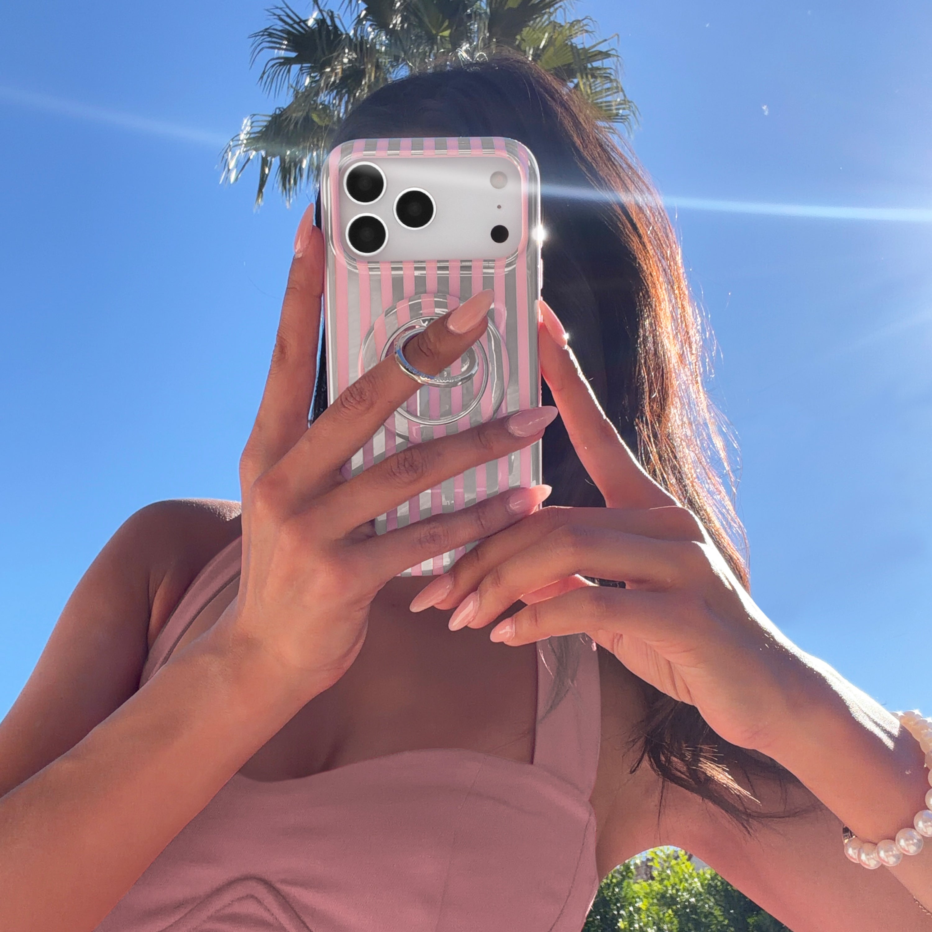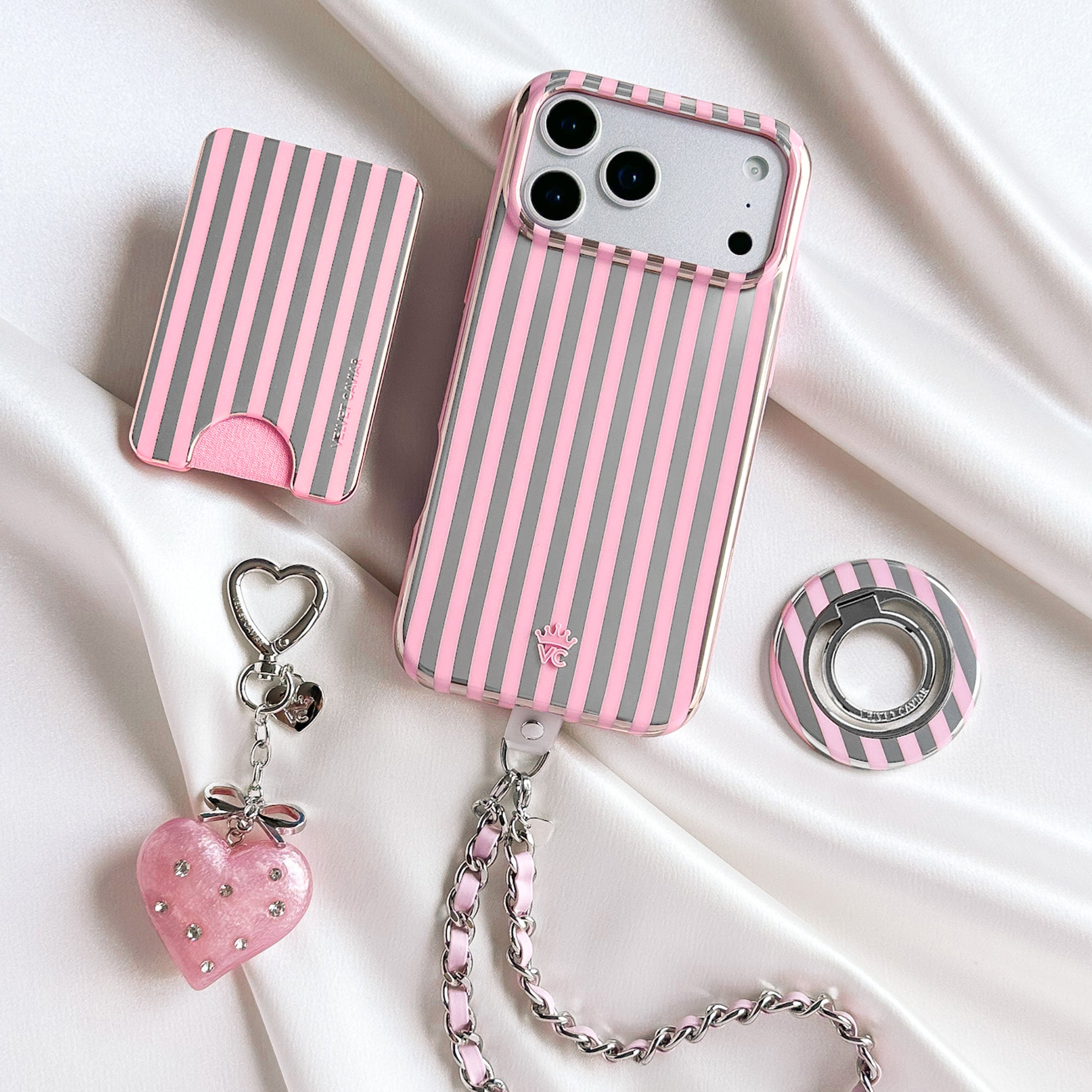 Pretty in Pink! This MagSafe case features glossy baby pink and silver chrome stripes throughout.
