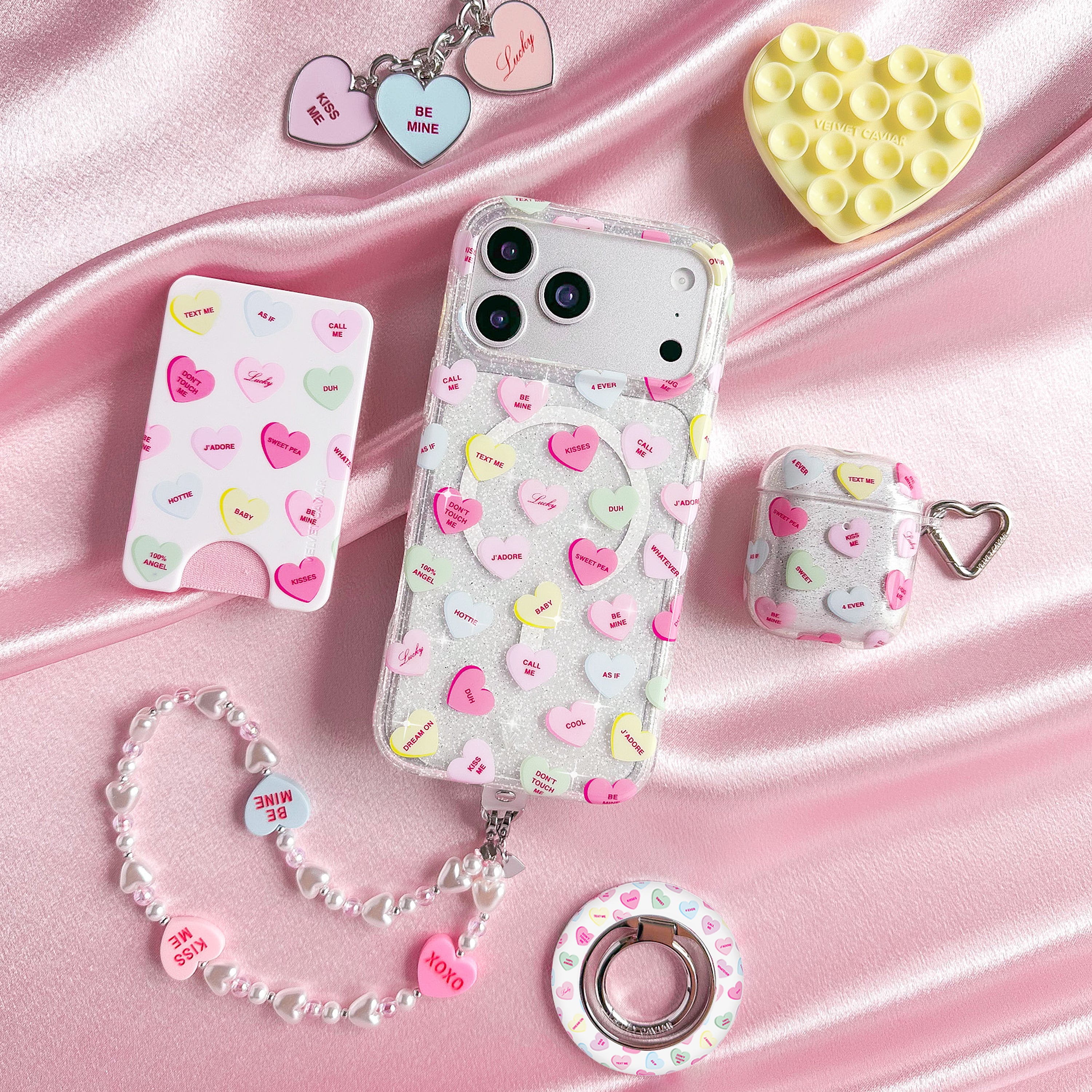 Sweet like candy! This Limited Edition MagSafe case features candy-inspired conversation hearts on a clear base with silver glitter sprinkled into the base and bumper.