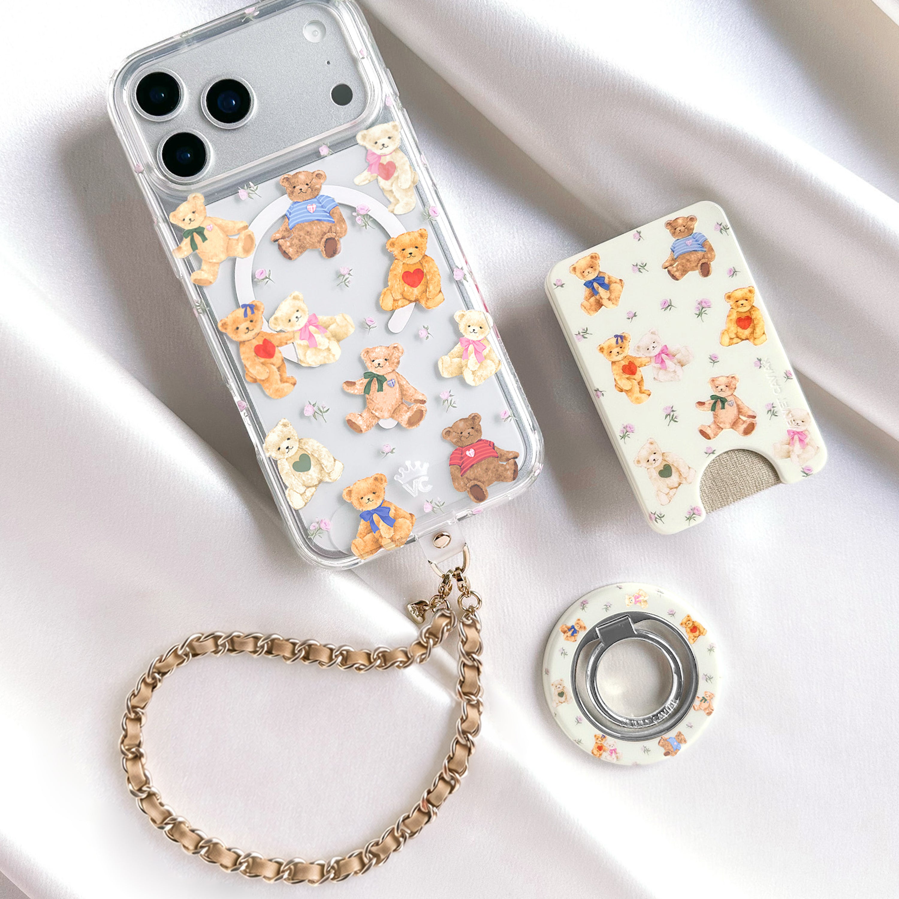 Where cute meets chic! This MagSafe case features a variety of hand drawn teddy bears and small dainty pink florals on a clear case.